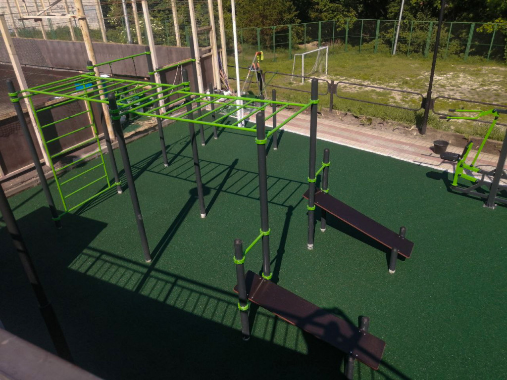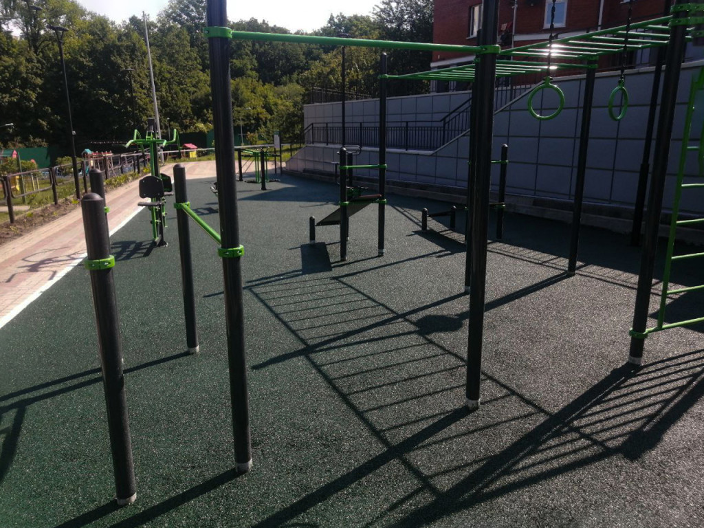 2. Обустроена зона воркаута с тренажёрами на разные группы мышц и мягким резиновым покрытием.