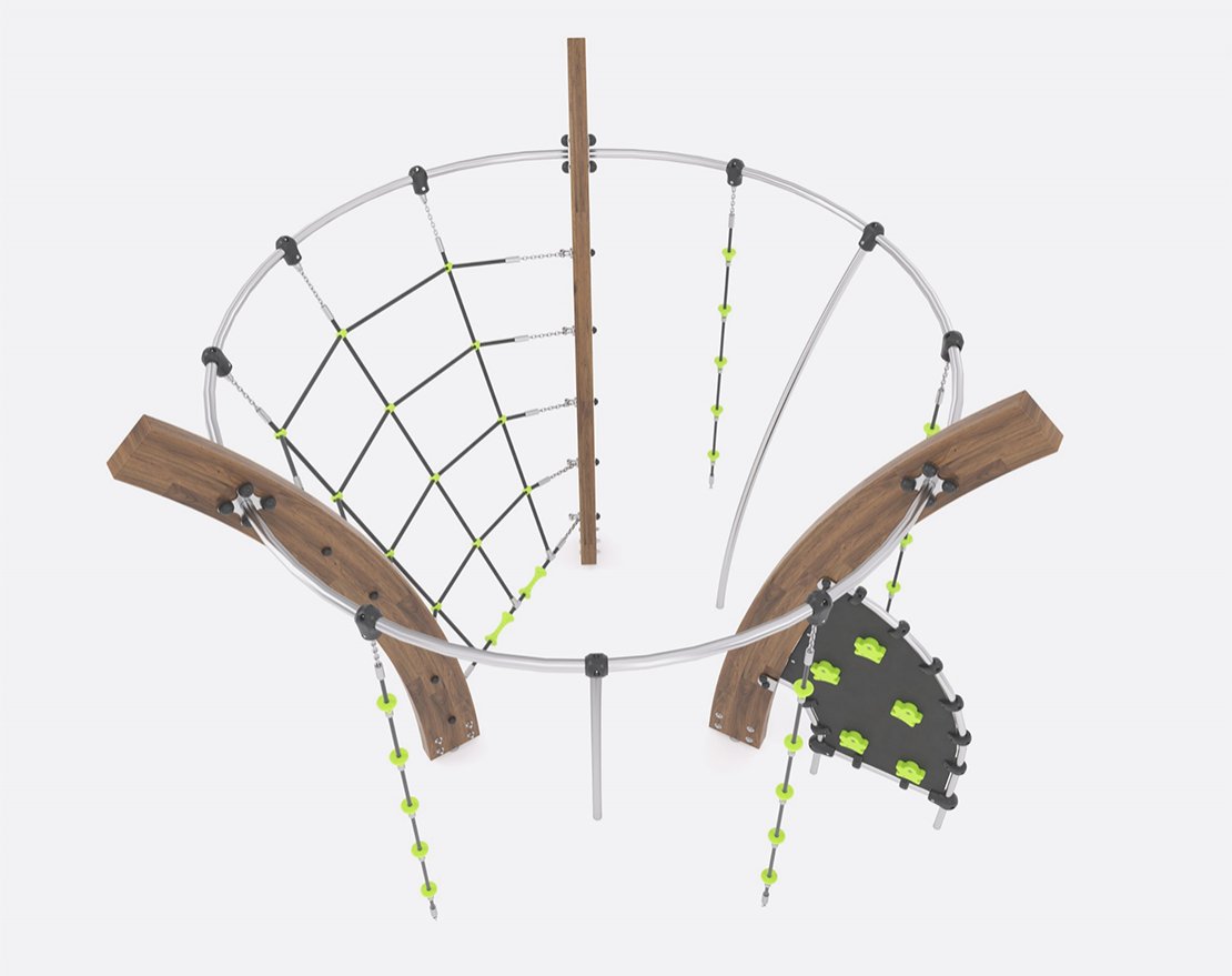 Представляет собой круговую замкнутую конструкцию. Выполнена из гнутого клееного лиственного бруса. Состоит из различных игровых элементов: канатной стенки, скалодромной панели с композитными зацепами, канатной стропой с пластиковыми уступами.