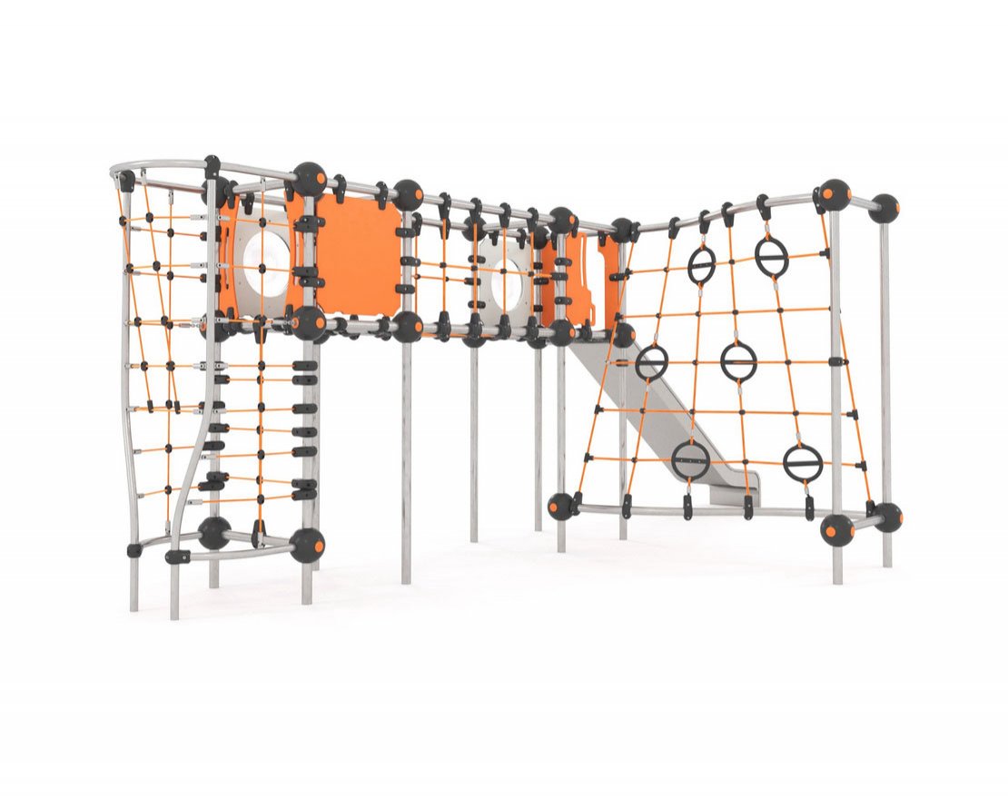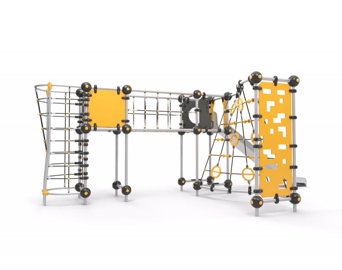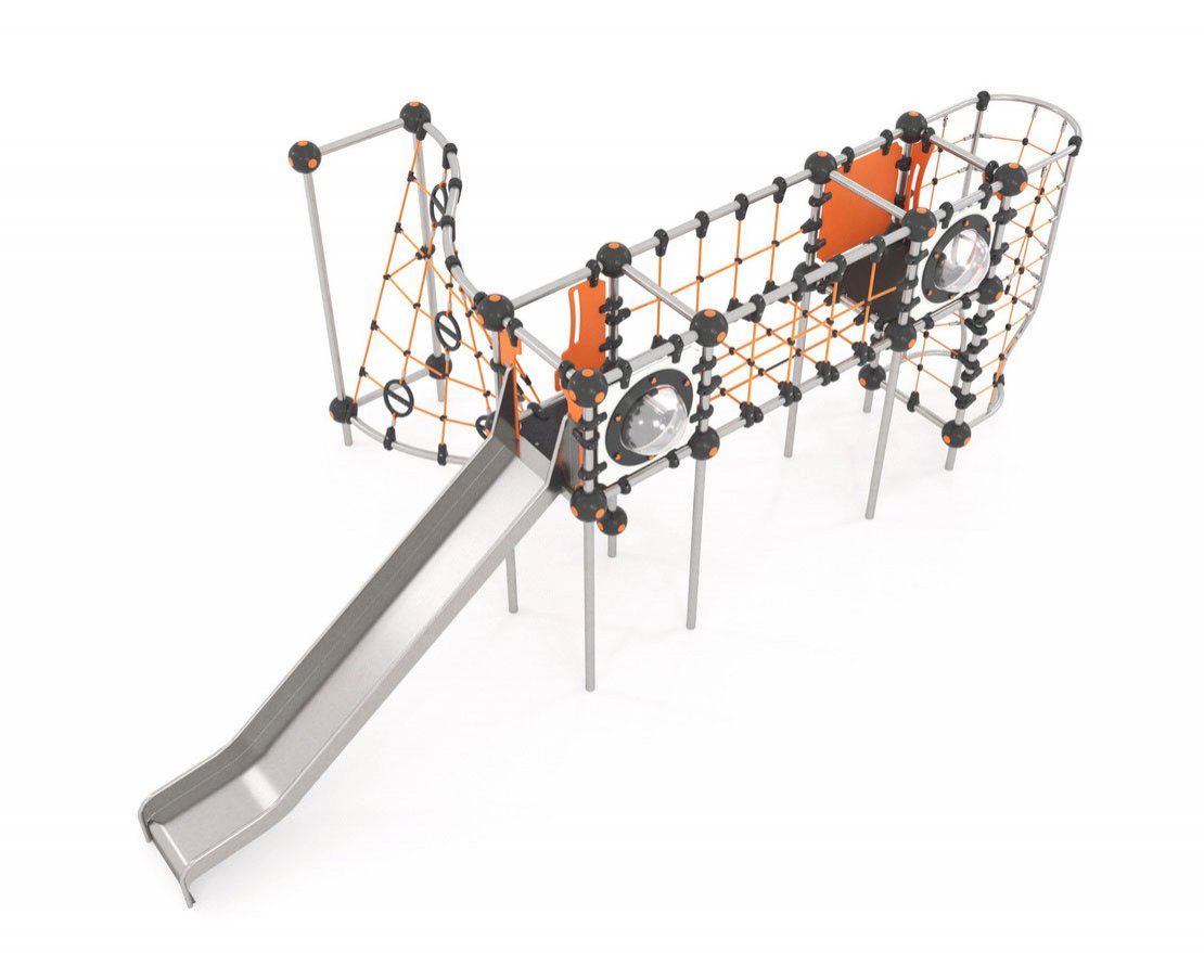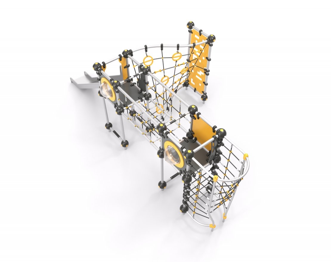 Состоит из металлического каркаса, канатной сетки с ручками-уступами, открытой горки с защитными бортиками, скалодромной панели и двумя вставками с иллюминаторами.