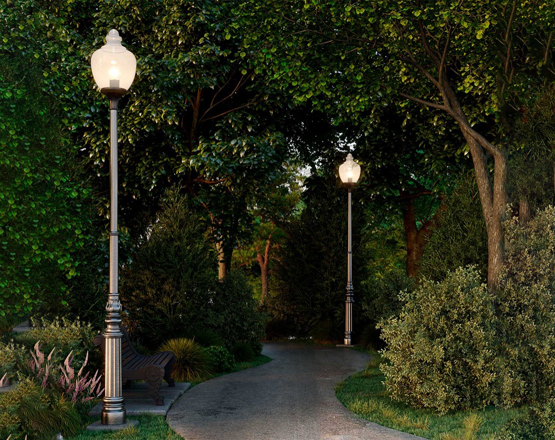 Функциональное и декоративное освещение парков, скверов, коттеджных поселков, прилегающих территорий зданий.
